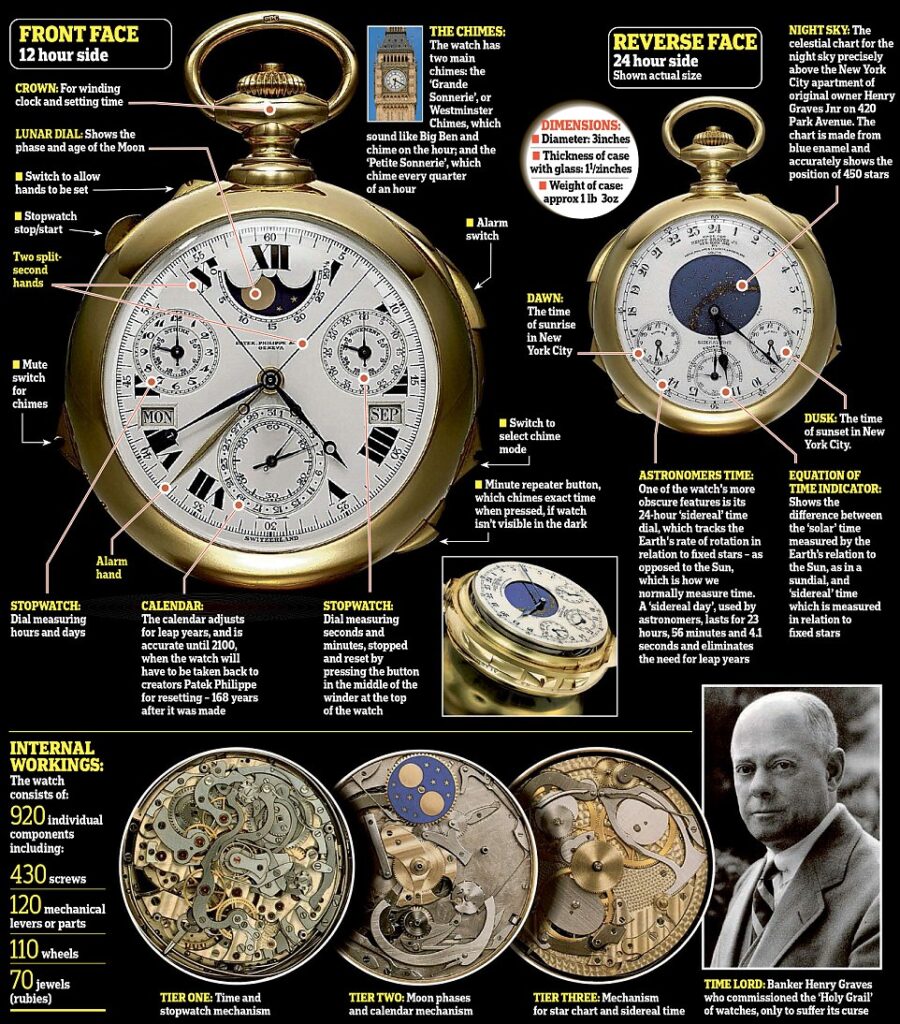 Efektem ich wspólnej pracy był zegarek oferujący poza pomiarem czasu 22 różne komplikacje, takie jak wskazanie czasu gwiazdowego i słonecznego, alarm, wieczny kalendarz o dokładności wyliczonej do 2100 roku oraz oczywiście chronograf rattrapante. To imponujące dzieło sztuki stanowi nie tyle wizytówkę kunsztu manufaktury Patek Philippe, ile bardziej pokaz geniuszu mistrzów zegarmistrzostwa z Valle do Joux.